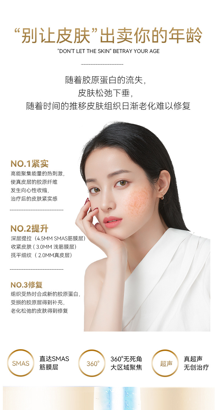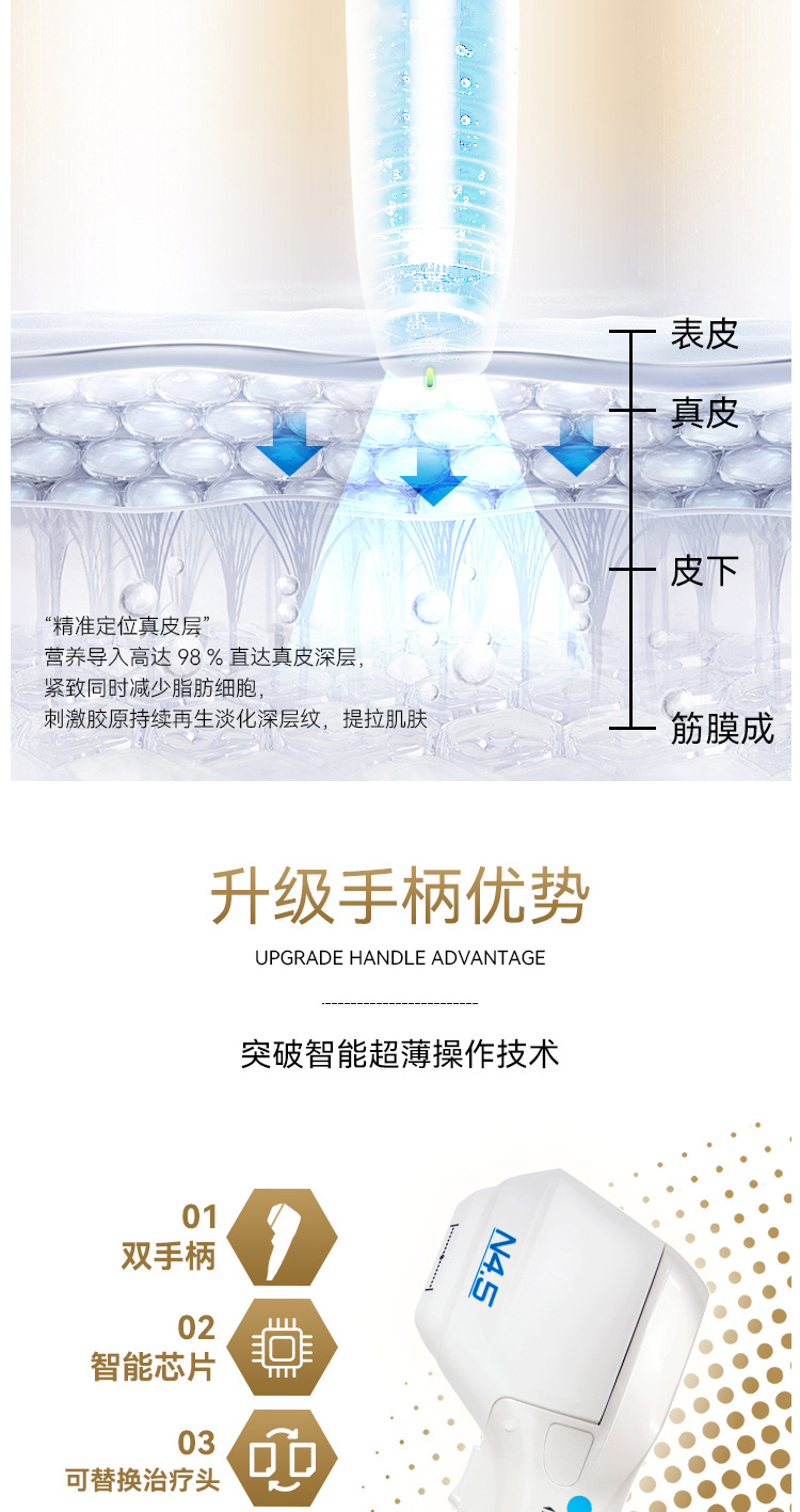 NO.2提升,深層提拉(4.5MM SMAS筋膜層)收緊皮膚(3.0MM 淺筋膜層)撫平細(xì)紋(2.0MM真皮層)