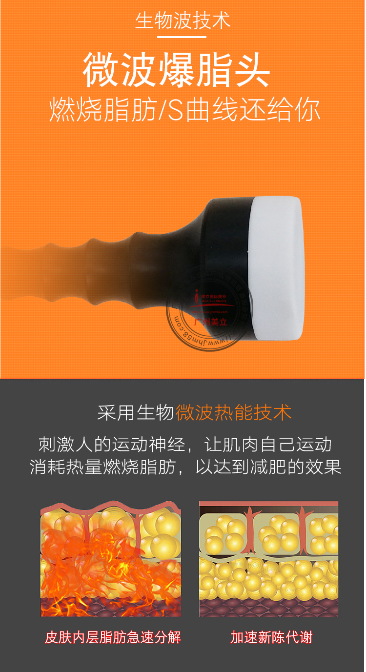 微波爆脂頭:采用生物微波熱能技術(shù) ,刺激人的運動神經(jīng),讓肌肉自己運動消耗熱量燃燒脂肪,以達到減肥的效果