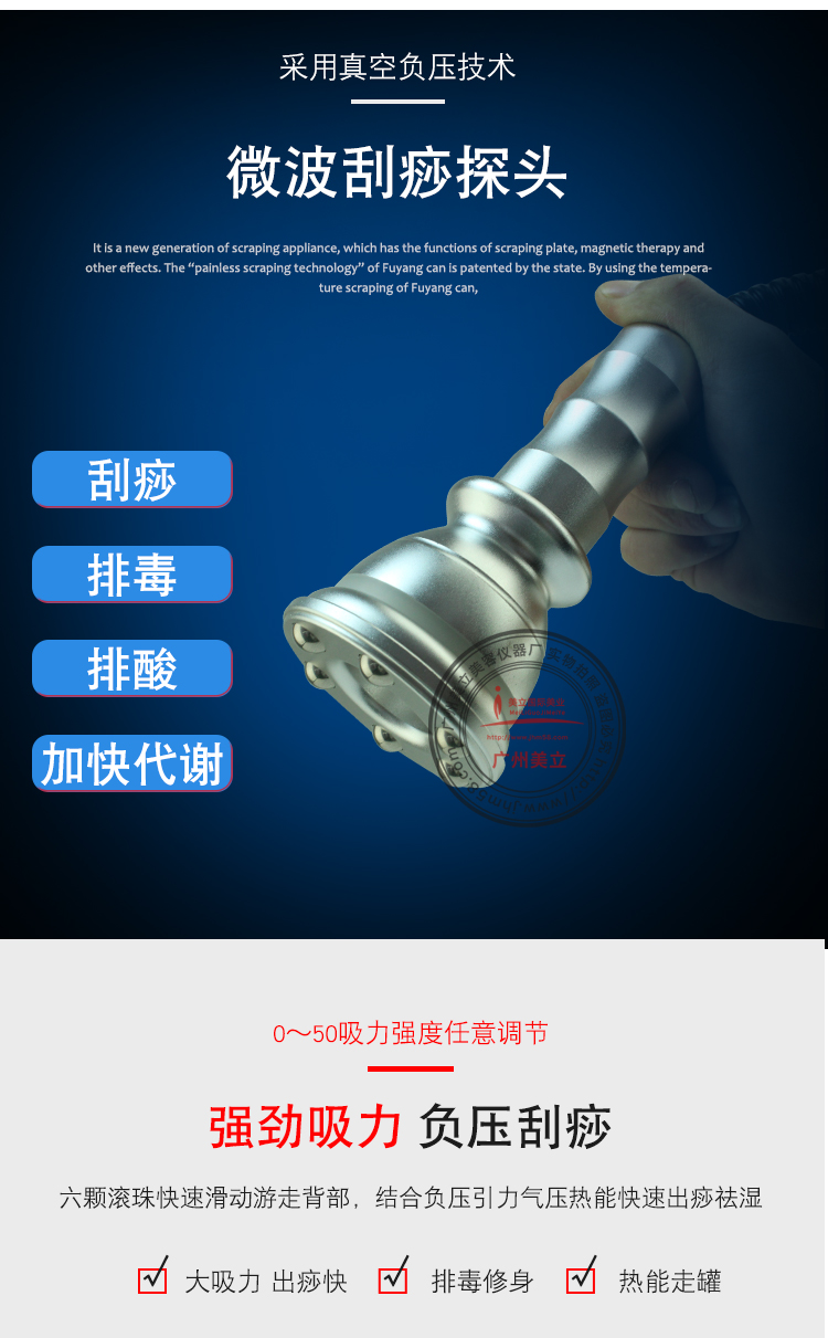 微波刮痧探頭:強勁吸力負壓刮痧,六顆滾珠快速滑動游走背部,結(jié)合負壓引力氣壓熱能快速出痧